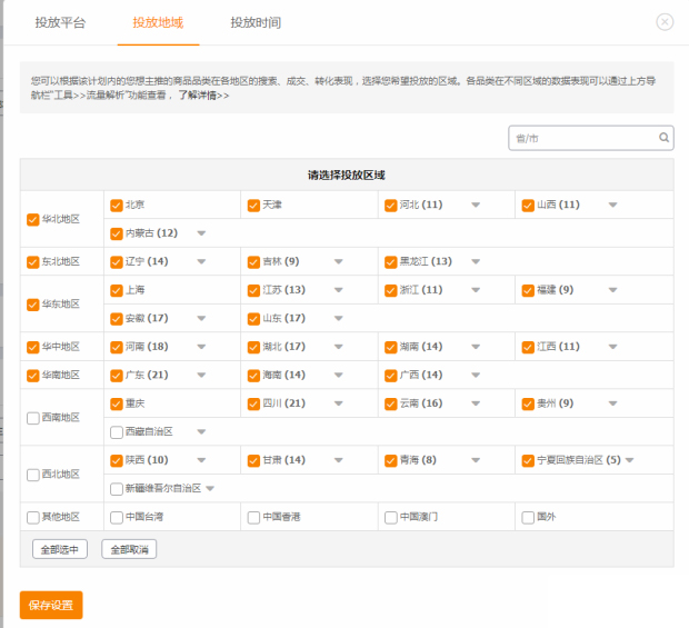 如圖四所示基本類目大部分是全地域投放(偏遠地區(qū)港澳臺除外),不排除一些特殊類目,比如像(羽絨服、供暖設備、溫帶動植物等)產品對投放地域的氣溫、季節(jié)、環(huán)境要求比較高的,會去篩選地域。一些類目在新品測款的時候個人建議是可以篩選地區(qū)的,避免投放一些對產品來說的無效地區(qū),一方面是帶來的流量不多,另一方面就是點擊轉化上不去。