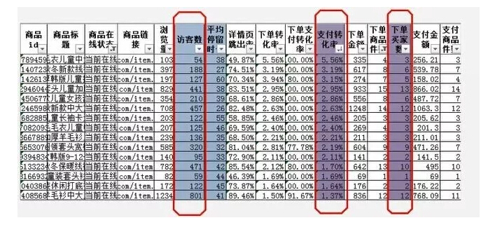 (2)如果產(chǎn)品不是同時(shí)上架的,要等幾天看訪客數(shù)是否上升。如果訪客數(shù)上升,轉(zhuǎn)化率依然比較高(至少和后幾款商品差不多),那么這款產(chǎn)品就可以作為主推款。